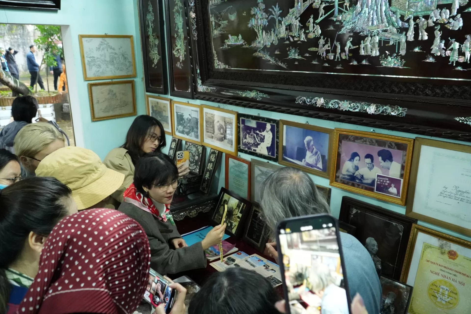Đoàn cũng đã tham quan đền thờ tổ nghề khảm trai, khu trưng bày sản phẩm, Bảo tàng nghề truyền thống, các cơ sở sản xuất khảm trai – sơn mài tiêu biểu trong xã. Tại đây, sinh viên được trực tiếp quan sát các công đoạn sản xuất tinh xảo như cưa, cắt, mài, khảm, sơn và đánh bóng sản phẩm. Nhiều sinh viên tỏ ra thích thú khi được thử sức với một số thao tác cơ bản dưới sự hướng dẫn của các nghệ nhân.